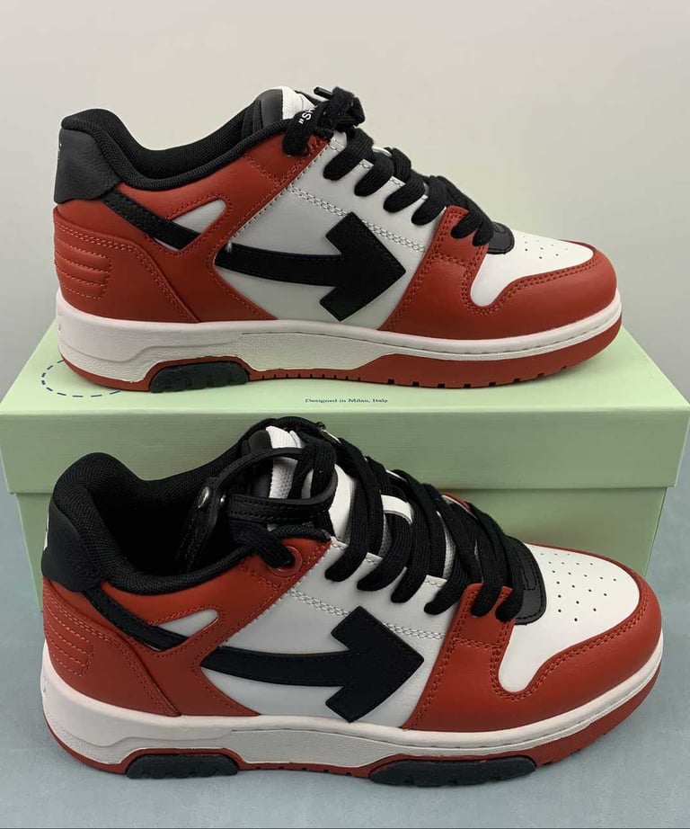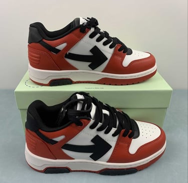 El famoso arrow de Off-White en un contraste brutal de rojo, blanco y negro. Diseño premium, streetwear puro y el toque de lujo que todos buscan